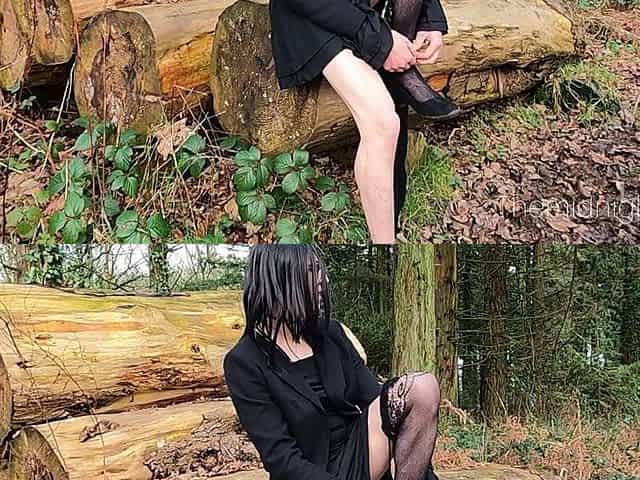 Crossdresser exposes on the roadside, then masturbates in a public restroom and ejaculates on his shoes