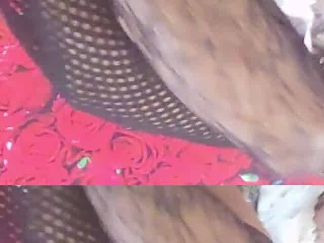 Sexy Crossdresser on Red Dress Puts Her Stockings. Nice Feet and Cock