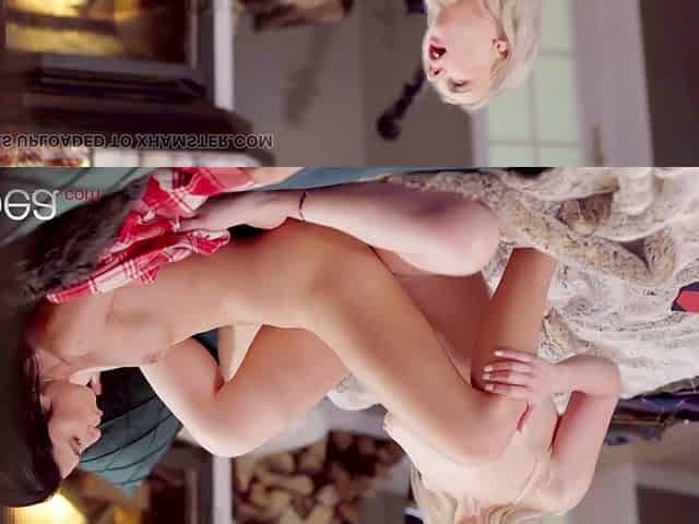 Blonde lesbians Ava Delanie and Mae Olsen enjoy intimate moments on the couch