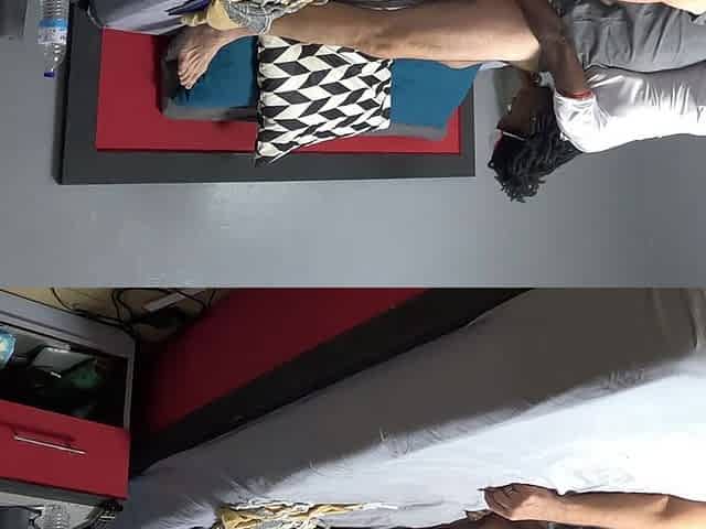 A doctor in pink medical gloves bangs fingers in the patient's butt.