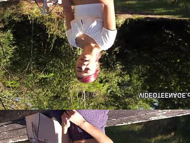 Blonde teen shows off her big natural tits in a public park