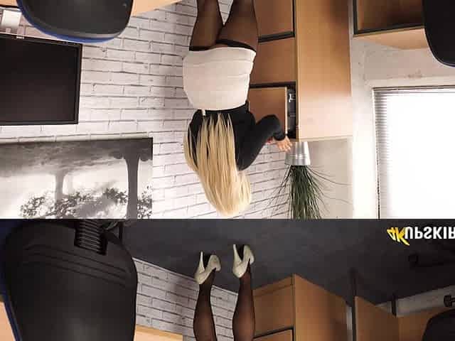Hawt taut cunt brunette hair secretary with high heels and a taut costume shows legs and butt