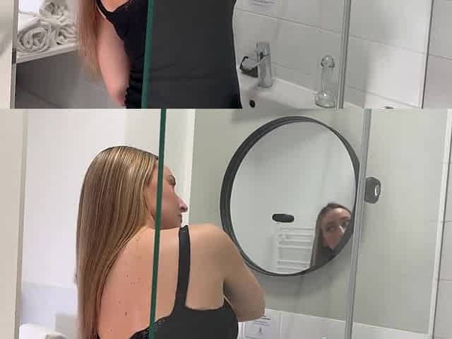 Sexy hot slender constricted cunt angel in the washroom prepares for night out in a pink cut mini petticoat