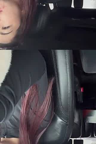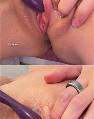 Brunette hair with tiny creamy twat plays with giant vibrator