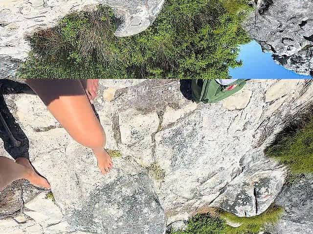 Hawt teen with petite saggy breasts swims bare in a public pool and touches a tiny jock