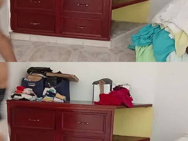 gordita ordenando el cuarto y doblando la ropa