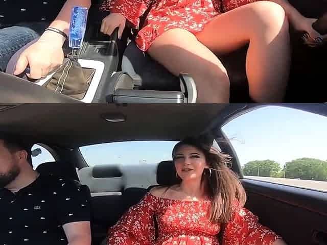 Girl in a car has her dress blown up, showing her panties
