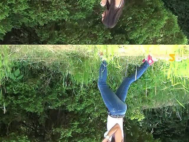 Sassy brunette gal in jeans Rebecca pees in the forest