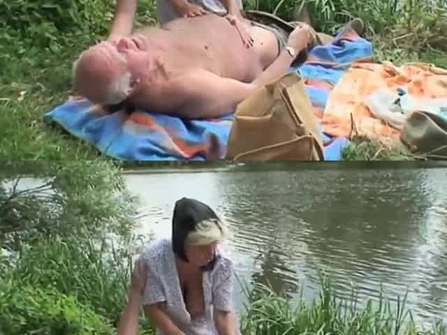 A blonde hotty washes herself by the river and 2 old chaps are watching her