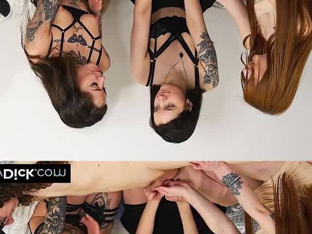 This guy's being made joy of by all 3 cuties watching his petite weenie on the daybed