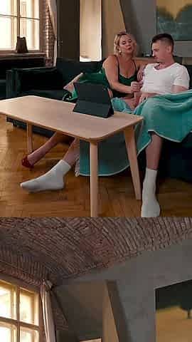 Stud watching TV is enticed by a breathtaking golden-haired who craves to be booty banged