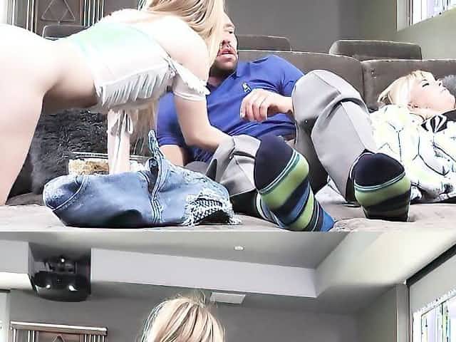 Blonde girl plays with stepdad's dick while watching movies