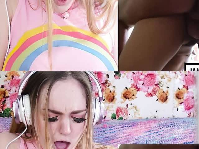 Solo blonde girl is watching hardcore porn videos while masturbating