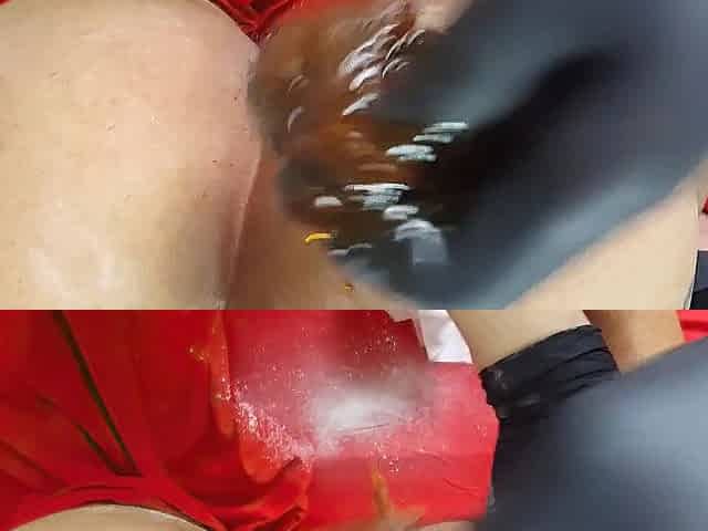 Wax, oil, lipstick fetish, BJ, huge toys DP