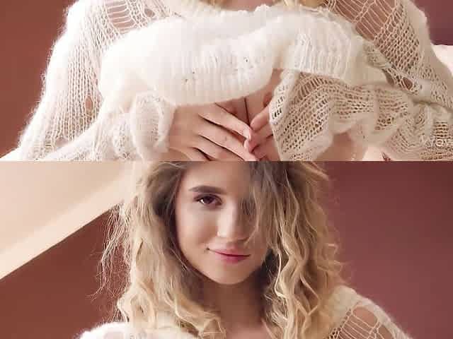 Blonde angel Mia Bloom shows of her wet shaved pussy in close-up