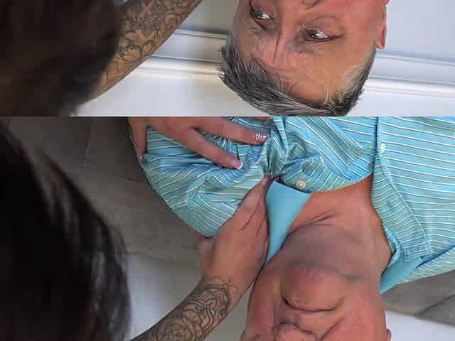 Beautiful ebony haired honey helps old chap relax and gets her cunt licked in award