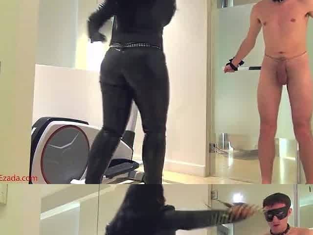 BDSM latex domina harasses subs asshole with whipping