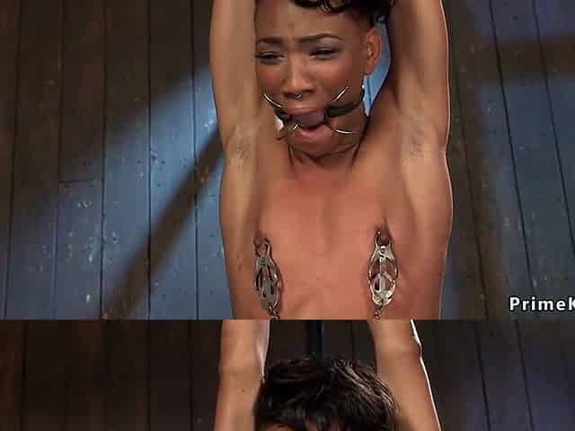 Busty nipple clamped fetish sub tit spanked and body whipped