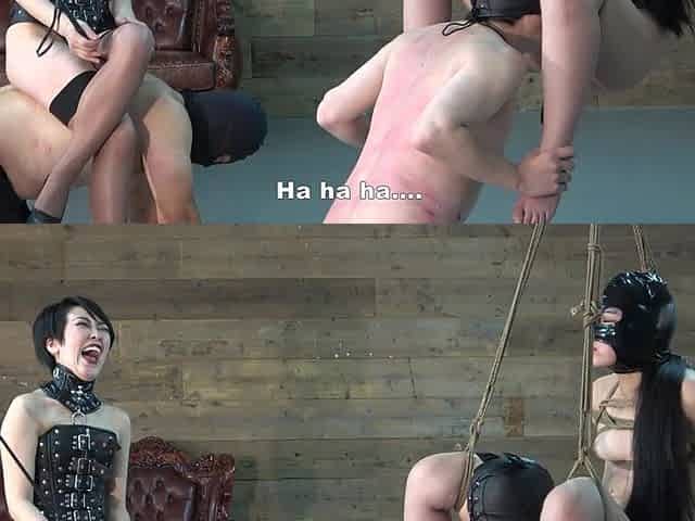 Mistress Whips Male Masochist Who Is Holding Dildo in His Mouth to Prevent It From Falling Out of Female Masochist Pussy