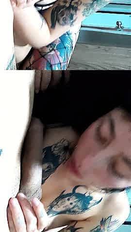 The tattooed cutie with the hairless cunt does a ribald booty to throat