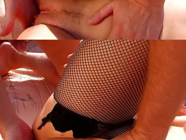 Beruka in open fishnet hose showing her soaked snatch