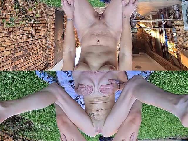 Pissing on Mia's tiny pussy while she holds her legs wide open in the air - garden sluts