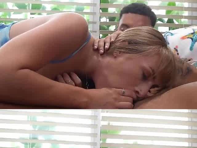 Unpretentious blonde Serena Marcus enjoys sucking two big black dicks