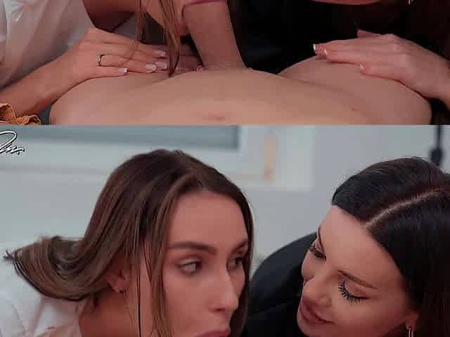Hot brunette slut gives double blowjob and ride two cocks li