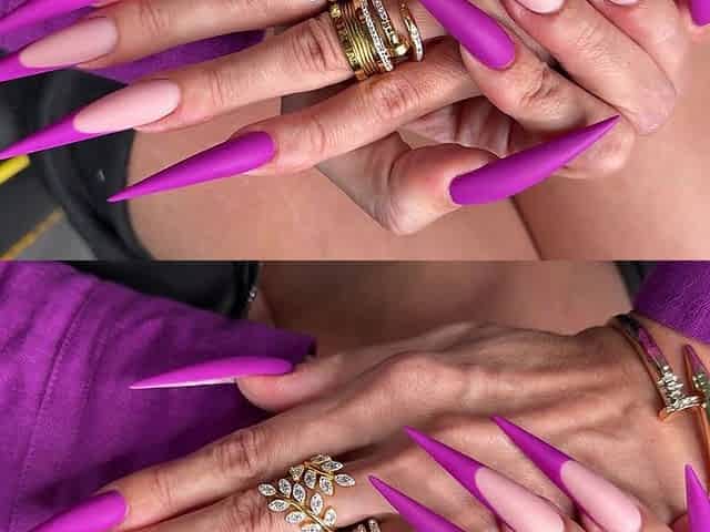 New Purple Color Long Nails, Sharp Stilettos, Palms, Long Fingers and Hands Worship, Purple Blouse and Leather Skirt on Me