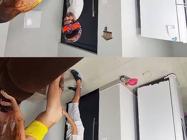Slut alone at home receives delivery boy wearing just a bath towel!