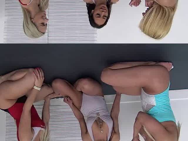 Lesbian amateur 3some wrestling on mat between hot dykes