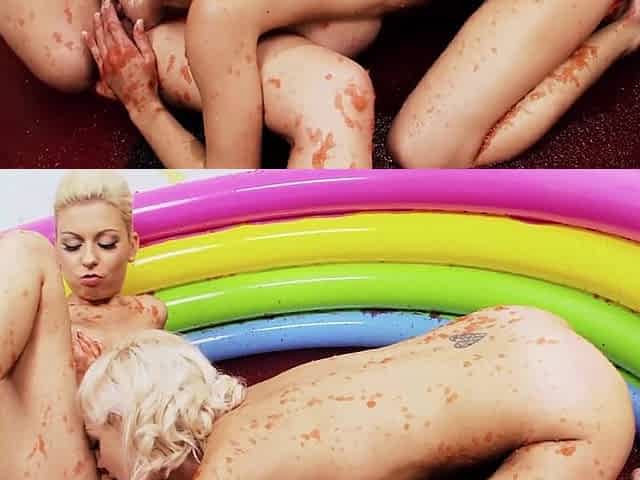 Jello wrestling and passionate fingering with two busty playful blondes