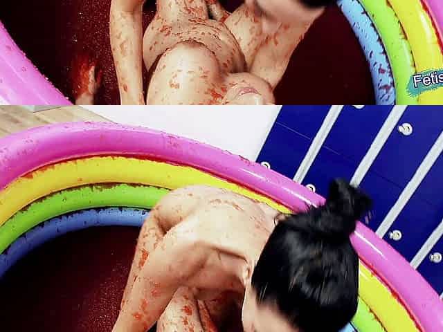 Lesbian brunette babes get naked and have dirty jelly wrestling